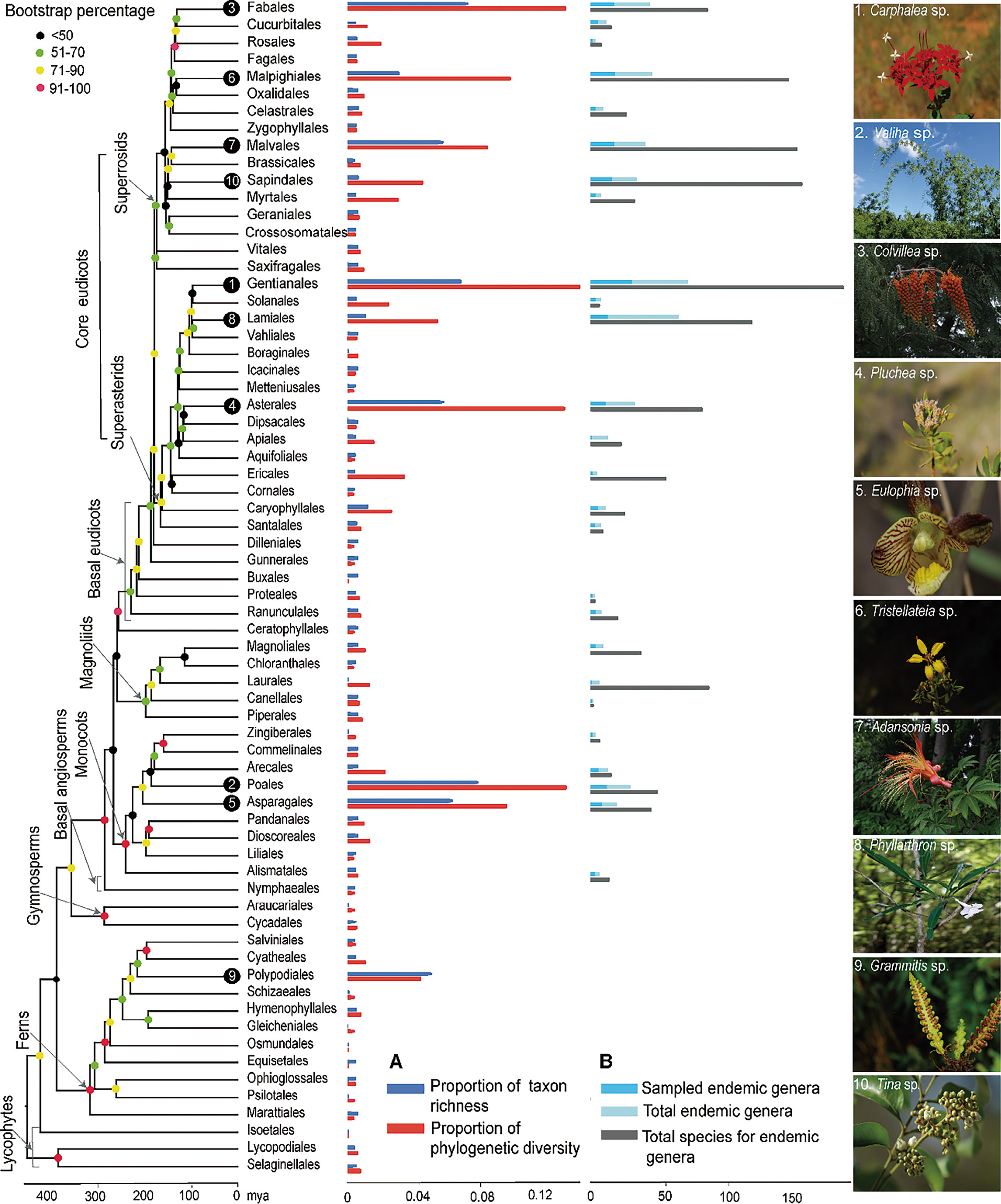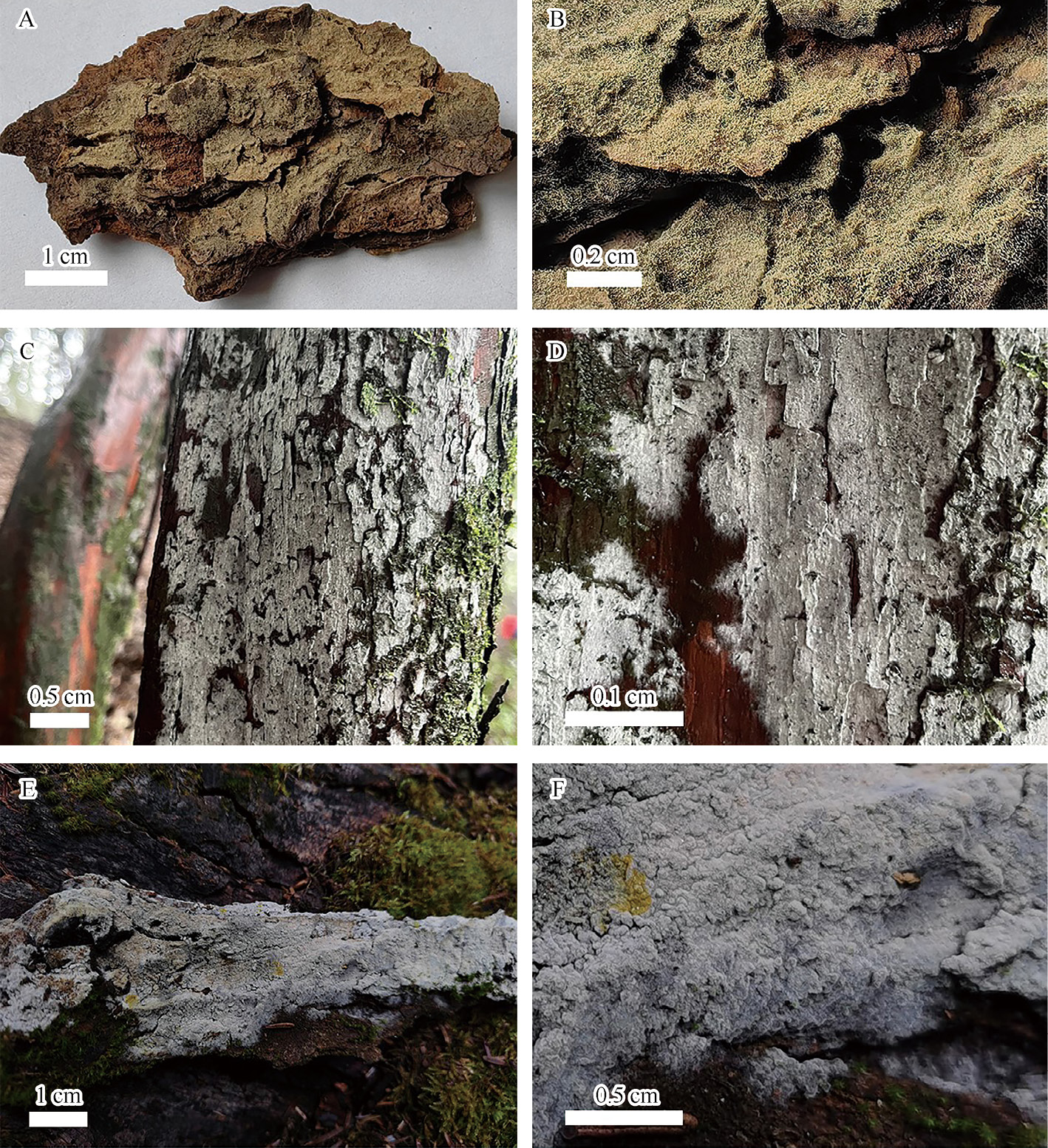 通过对不同气候带上的14个省(区、市)的30余个自然保护区、林场开展野外考察和标本采集,综合利用形态学和分子系统学方法,对疣孢革菌属开展了系统研究,发现了新分类单元15个,发表了其中4个与干巴菌亲缘关系较近的物种(图3-91),并提供了用于区分这些物种的标准序列。此外,更正了DNA序列数据库(GenBank)中300余条错误定名的干巴菌序列(图3-92)。