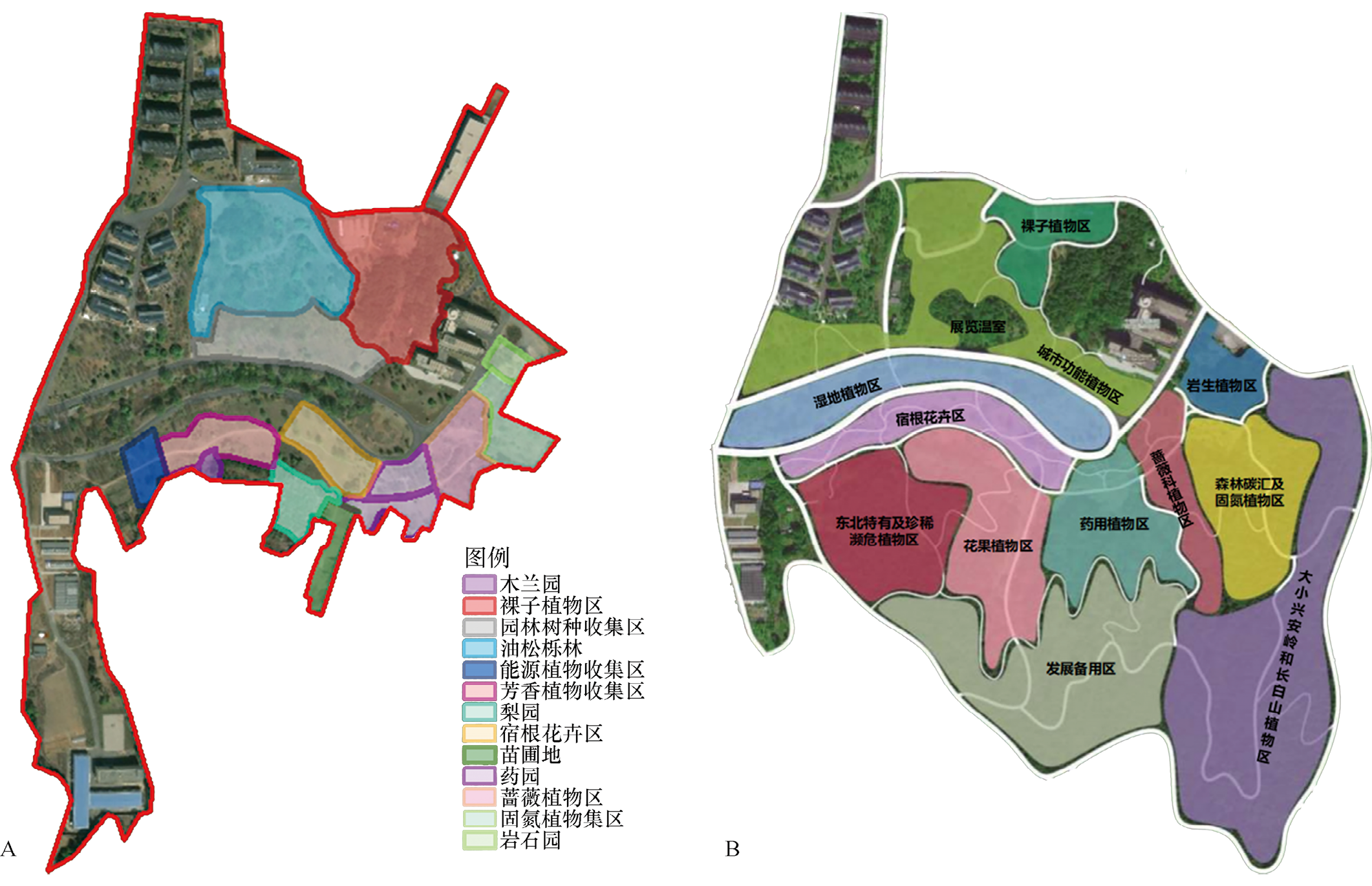 图3-84 概念规划(A)与总体规划分区(B)对比