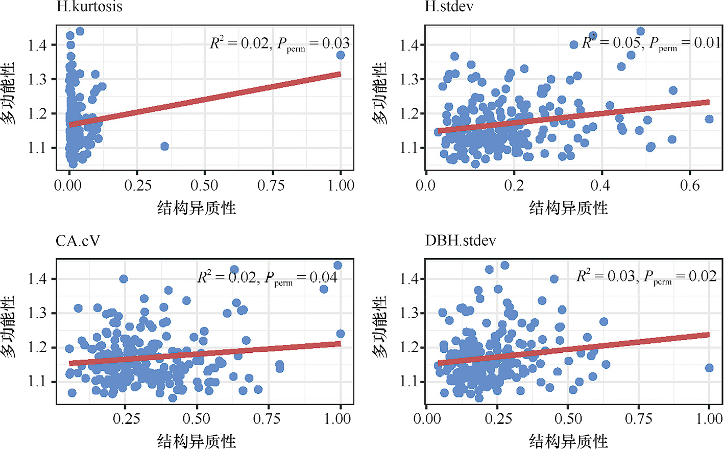 2)通过线性回归分析,解析了城市森林群落结构因子对群落多功能性的影响。结果表明,平均树高、胸径、枝下高和森林密度及冠幅异质性均显著促进了城市森林多功能性,而干形弯曲程度降低了多功能性(图3-88)。