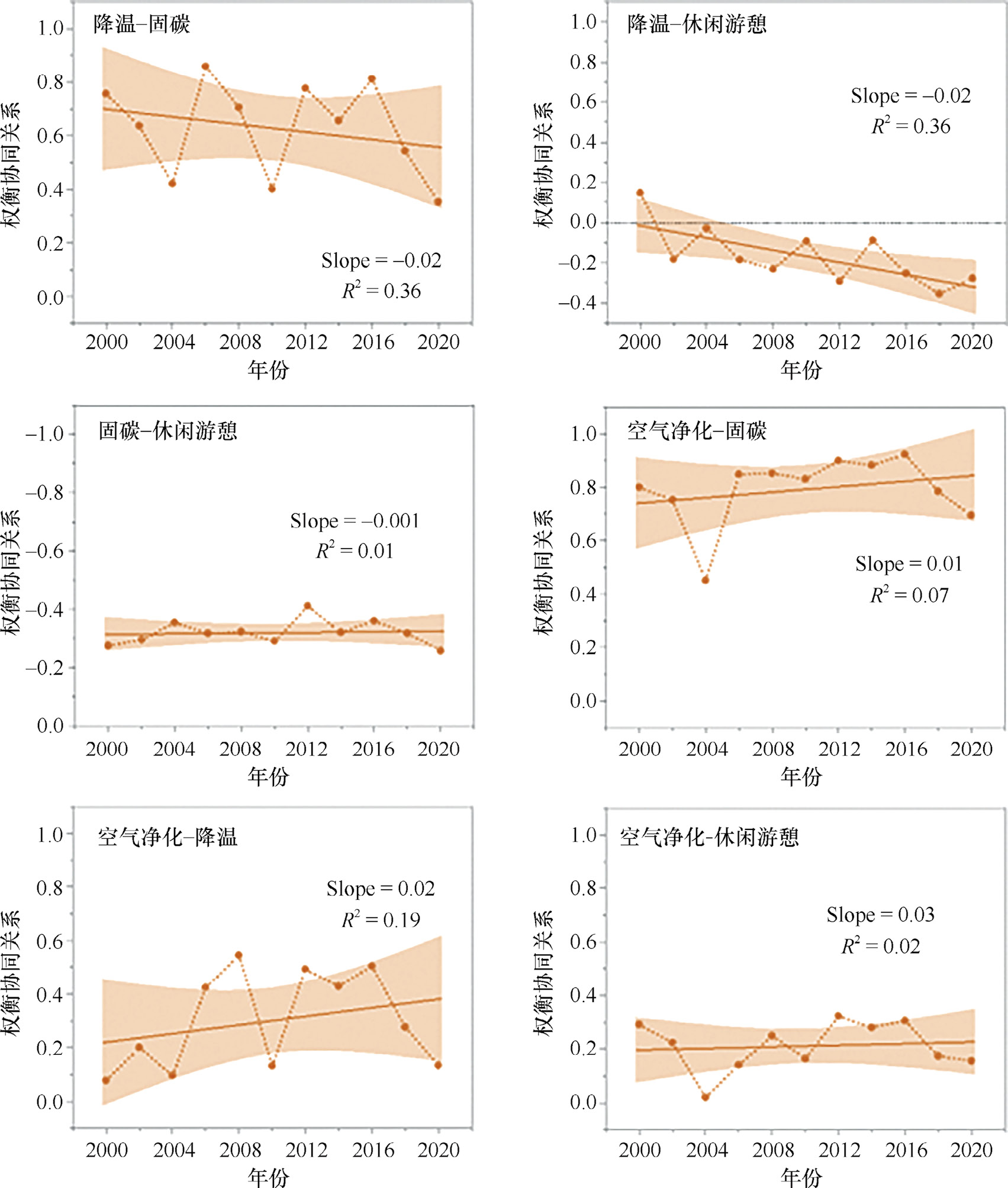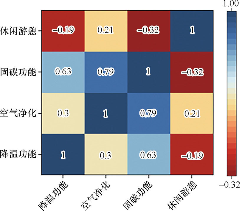 3)明确了城市森林景观多功能权衡与协同关系及其时空变化规律。研究表明,长春市城市森林的休闲游憩功能分别与固碳和降温之间存在显著权衡关系;固碳功能与空气净化功能之间的协同关系最强(R=0.79)(图3-89)。