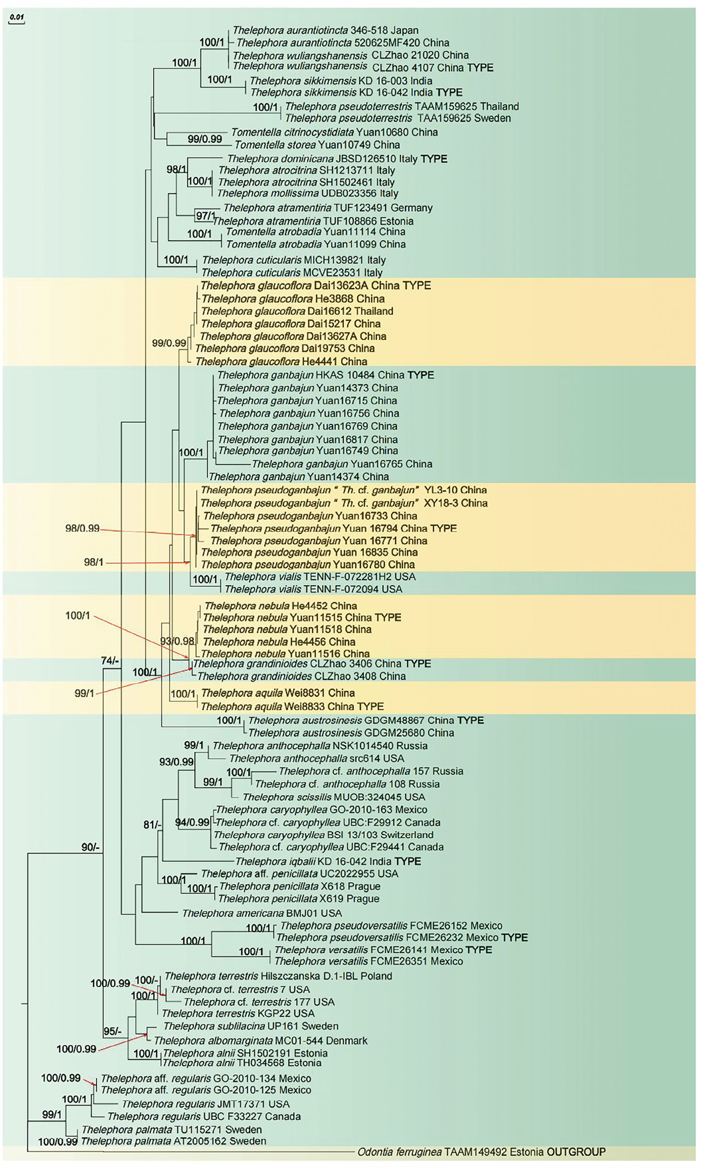 疣孢革菌属(Thelephora)是一类外生菌根真菌,发挥着重要的生态功能。该属部分种类具有食用和药用价值,如干巴菌(Thelephora ganbajun)鲜香美味、具有重要的经济价值,但在云南等地的干巴菌市场中多物种混杂,因此澄清该类真菌的物种组成具有科学和实践意义。