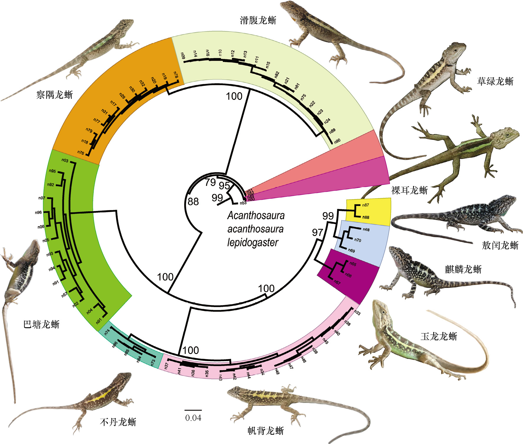 新评估框架基于龙蜥物种分布范围、当前和未来气候适宜区、适宜栖息地和有效种群大小进行秩合统计,计算出每个物种的风险排序分数(risk ranking score,RRS),用于评估物种受威胁等级。评估结果表明,察隅龙蜥(Diploderma yangi)和麒麟龙蜥(Diploderma qilin)当前受威胁等级最高;而帆背龙蜥(Diploderma vela)、巴塘龙蜥(Diploderma batangense)、草绿龙蜥(Diploderma flaviceps)、裸耳龙蜥(Diploderma dymondi)、玉龙龙蜥(Diploderma yulonggense)和滑腹龙蜥(Diploderma laeviventre)预计未来会发生严重的分布范围和潜在栖息地丧失,其受威胁等级应从“无危”(least concern)更新为“易危”(vulnerable)。此外,研究还发现龙蜥物种的头体长、相对尾长和相对头宽与风险排序分数之间存在显著的统计相关性,这意味着这些形态特征可在数据缺乏的情况下初步推断物种受威胁状况。该研究改进了现有物种风险评估框架并展示了其有效性,为濒危物种保护提供更科学、更准确的参考信息,将对研究相对匮乏物种的风险评估发挥重要作用。相关研究成果以“Enhanced risk assessment framework integrating distribution dynamics, genetically inferred populations, and morphological traits of Diploderma”为题,发表于Zoological Research。