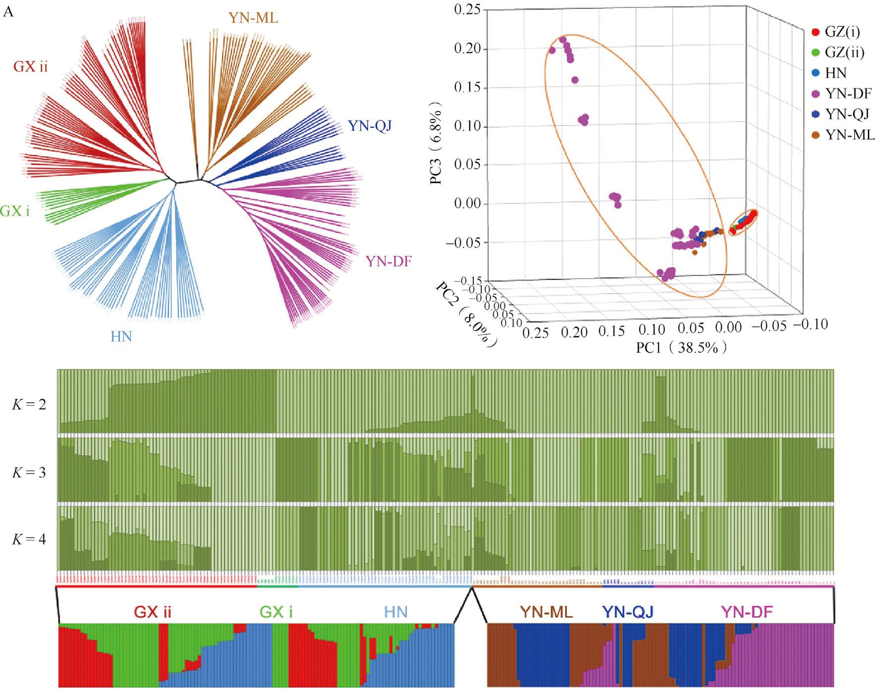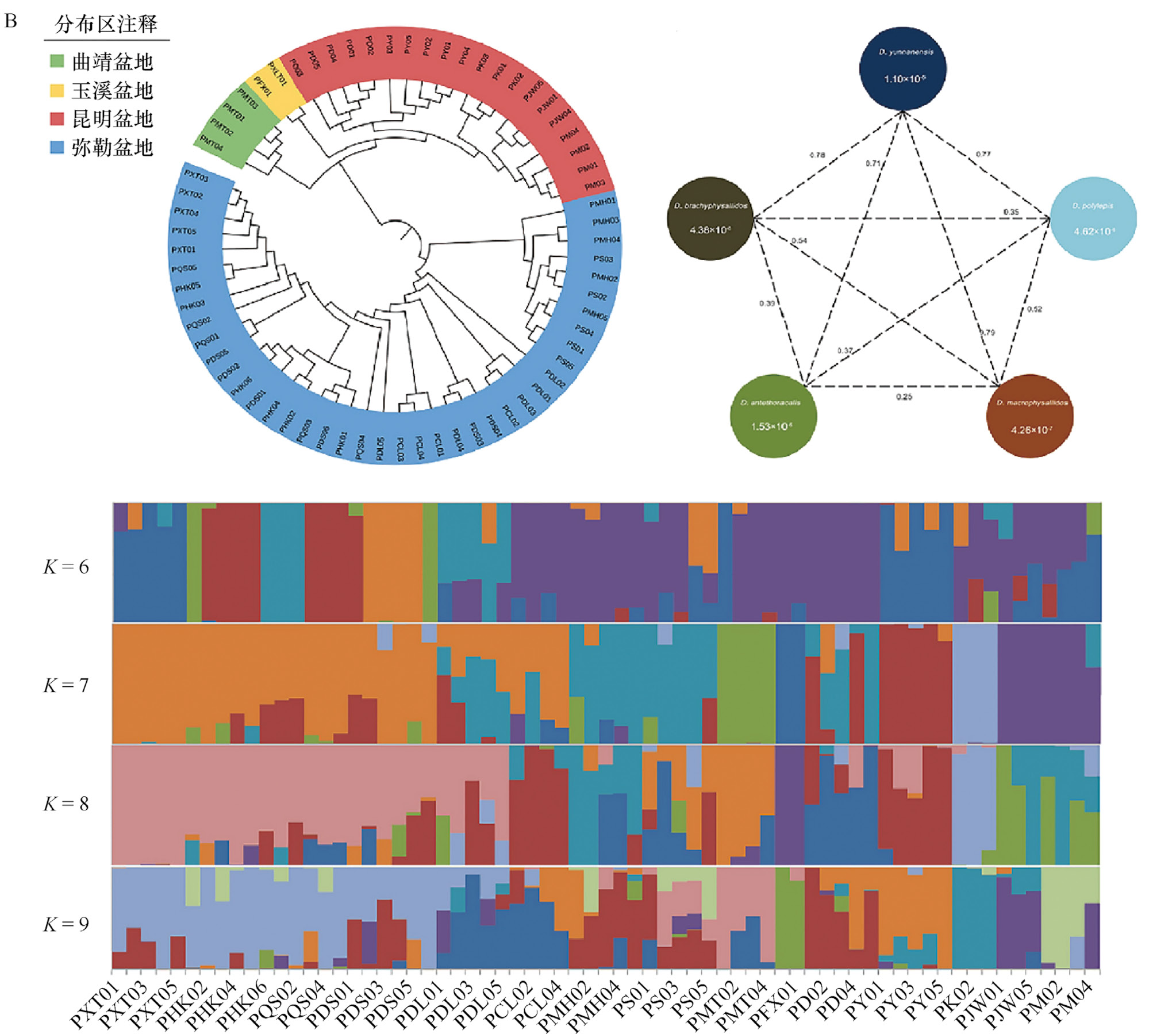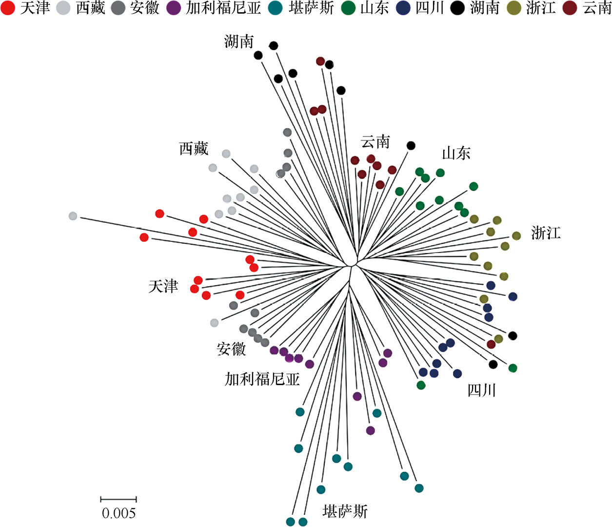 美国牛蛙的引入和分布范围扩大是中国发生的严重的生物入侵的一部分。这种有害的两栖入侵物种具有很强的适应性,经过引进和传播,它在中国许多省份建立了自己的生态位,且分布范围正不断地扩大到更多地区。以往的研究记录了牛蛙的引入时间,以及利用线粒体计算了其在中国遗传多样性的变化,但在中国的具体引入途径仍不清楚。两爬网李义明研究员团队采用全基因组扫描检查了美国牛蛙内的单核苷酸多态性和微卫星,用以筛选来自中国八个省份和美国两个州(包括牛蛙原产地堪萨斯州)的这些入侵两栖动物物种的基因组(图3-52)。该研究共利用1 336 475个单核苷酸多态性位点和17个微卫星位点计算牛蛙的遗传多样性及其迁移途径。结果表明,湖南种群是最先被引入和传播的,并且可能存在多个亚群的引入。此外,由于瓶颈效应,尽管中国牛蛙种群中SNP和微卫星位点的遗传多样性均低于美国种群,但牛蛙可以适应并迅速传播。该研究将为预防和控制未来将入侵物种引入到中国的自然栖息地提供重要见解。该研究成果以“Variations in Genetic Diversity of Invasive Species Lithobates catesbeianus in China”为题发表于Animals。