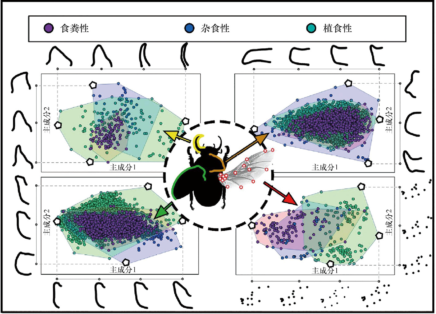 动物共生菌群的决定机制是微生物生态学研究中的热点问题,但气候与动物共生菌群多样性的关系尚未获得系统性研究。山地两栖动物由于迁徙能力和迁移范围有限,不同地理种群的个体往往处于不同的气候条件下,因而成为研究这一问题的理想模型。两爬网江建平研究团队利用青藏高原东部126个两栖类动物的微生物样本(64个肠道微生物样本和62个皮肤微生物样本)和101个环境微生物样本(51个土壤环境样本和50个水环境样本),解析了宿主因子、气候因子、共生菌群和环境菌群之间的空间关联性(图3-51)。研究发现,尽管宿主因子(如物种和性别等)是影响共生微生物群落的主要驱动因素,但气候因子(如年降雨量等)亦是影响两栖动物共生菌群的重要因素,与肠道微生物的多样性和皮肤微生物的功能多样性具有显著的关联性。利用结构方程模型,我们进一步解析了这一关联性的生态学机制。结果表明环境水体中的微生物群落是两栖类动物共生菌群的重要来源,对环境气候变化敏感,这一敏感性介导了气候因子与动物共生菌群之间的间接关联。这些发现加深了我们对两栖类动物共生菌群决定机制的认识,强调了气候环境对动物共生菌群的塑造作用,提示了气候变化影响两栖动物的新途径。相关成果以“Microbial diversity in mountain-dwelling amphibians: The combined effects of host and climatic factors”为题,发表于iScience。