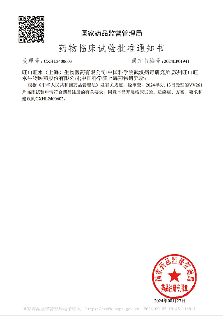 2024年10月24日,上海药物研究所研发的化药1类抗生素新药SM-V-61正式获得国家药品监督管理局的临床试验批准通知书,同意开展临床试验。临床前研究表明,SM-V-61对临床常见的革兰氏阳性(包括耐药)致病菌(如葡萄球菌属、肠球菌属、链球菌属等)的抗菌活性较万古霉素高2~3个数量级、较特拉万星高1个数量级,并且较新一代脂糖肽类抗生素具有更为合理的药代动力学特性和安全性。该新药有望为革兰氏阳性菌,特别是耐药菌(如MRSA、VRE、VISA、VRSA等)感染的患者提供安全、有效的治疗新选择。